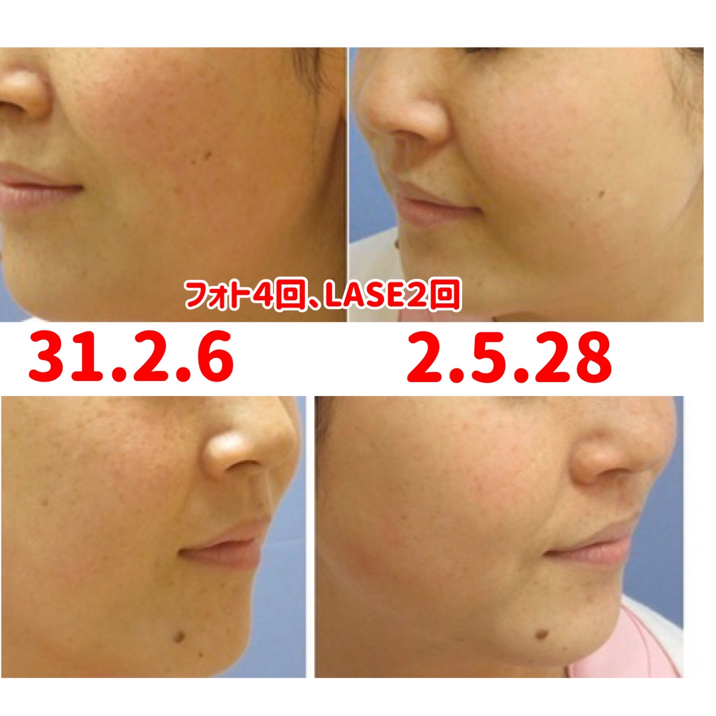上の写真はフォトフェイシャル4回、レーザーフェイシャル2回を